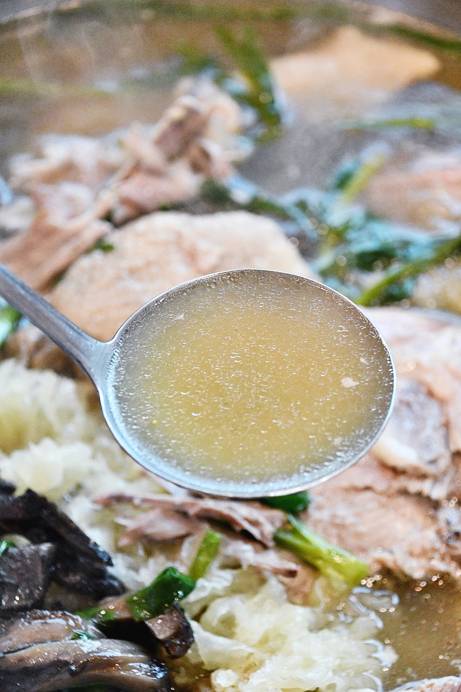 고기는 이미 부드럽게 익어 있어 살을 발라내기 어렵지 않다. 한 점 집어 그대로 먹어보면 잡내 없이 담백하고, 국물에 살짝 적셔 먹으면 깊은 풍미가 더 살아난다. 국물은 진하면서도 과하게 기름지지 않고, 은은한 한방 향이 올라와 계속 떠먹게 된다. 능이버섯은 향이 진하면서도 쫄깃하고, 목이버섯은 국물을 머금어 촉촉한 식감을 더해준다. 이 조합 덕분에 왜 이곳이 팔공산 오리 백숙 맛집으로 불리는지 자연스럽게 고개가 끄덕여진다.
