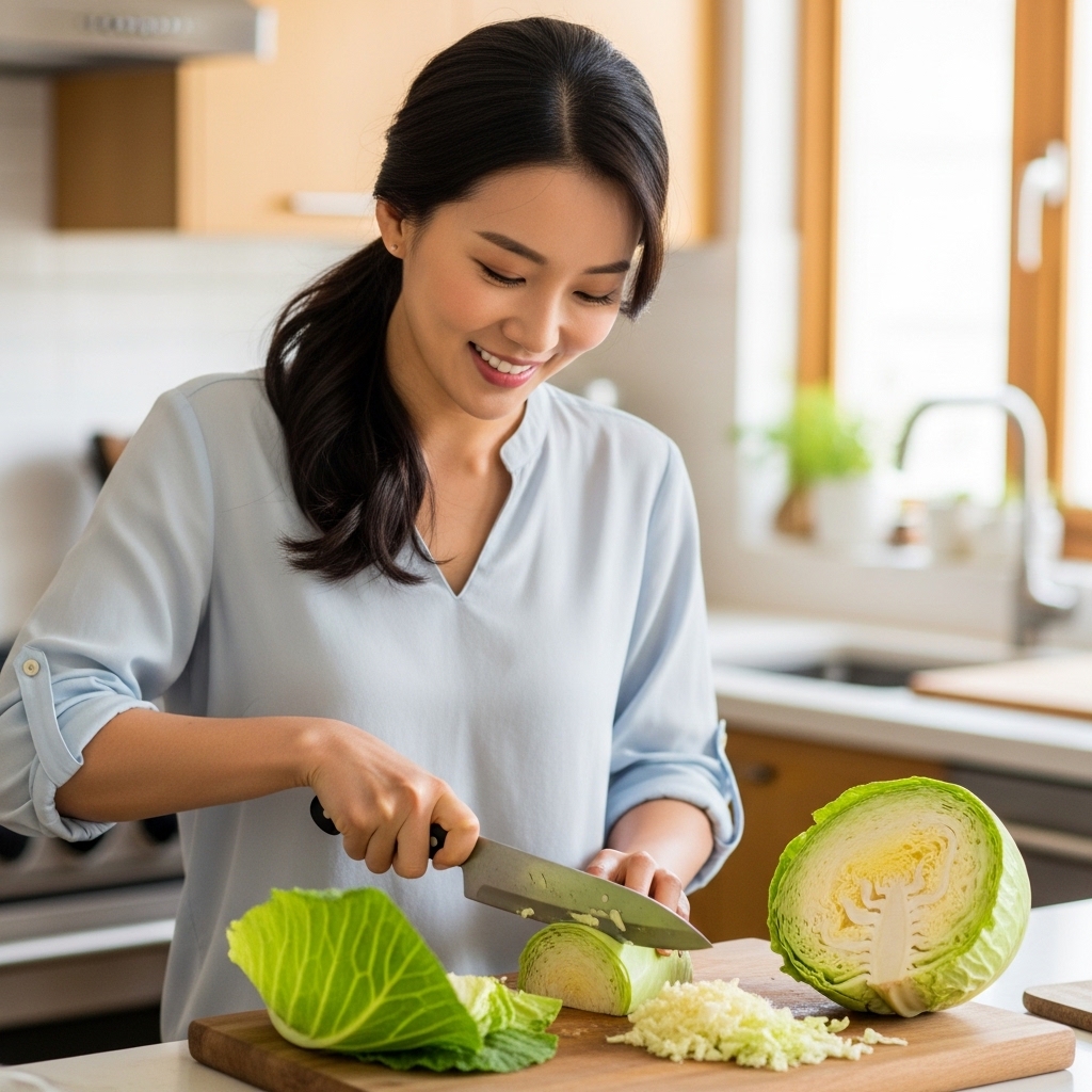 양배추는 깨끗이 씻어 물기를 털어낸 후, 먹기 좋은 크기로 썬다. 너무 두껍지 않게 채 썰면 양념이 잘 배어 더 맛있어요.